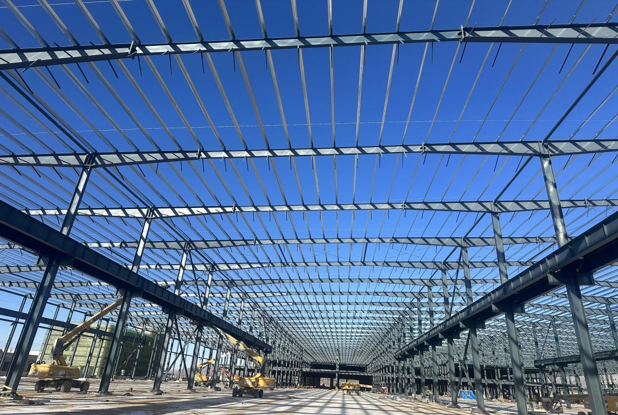 緯景儲能鋅鐵液流電池(包頭)智造基地建設項目,位于內(nèi)蒙古自治區(qū)包頭市青山區(qū)。項目建設用地面積約208075.97平方米,建筑面積約152150.68平米。廠房A區(qū)長199米,寬180米,單體建筑面積約36000平方米。結構形式為單層多跨剛架廠房,最大跨度40米。屋蓋系統(tǒng)為焊接實腹屋面梁、冷彎薄壁C型檁條、角鋼支撐,圓鋼管系桿;柱子系統(tǒng)采用焊接十字型鋼柱、縱向設置柱間支撐及剛性系桿;吊車梁系統(tǒng)采用焊接工字型實腹式鋼吊車梁。